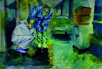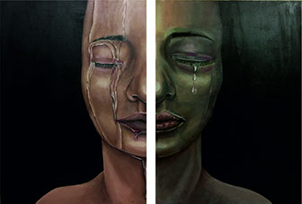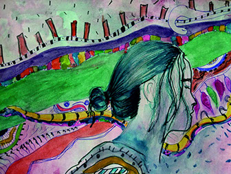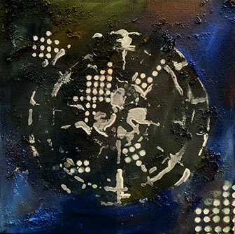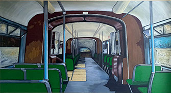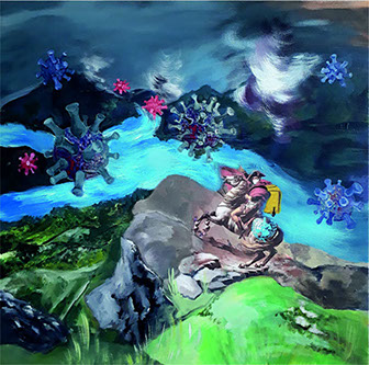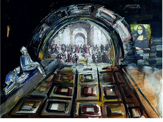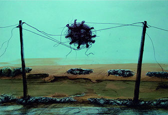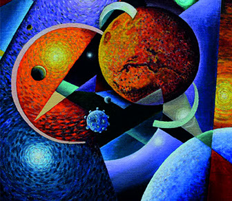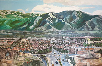 Mustafa Küçüköner - 130x200cm TÜAB "Mesafe siz siniz" adlı bu resimde uzakta da olsa sevdiklerimiz hep bizimle, sevdiğimiz yerler hep yanıbaşımızdadır. Yol ve Yolculuk (Hz. Mevlana'nın yoluna çıkan kentler serisi: Erzincan)